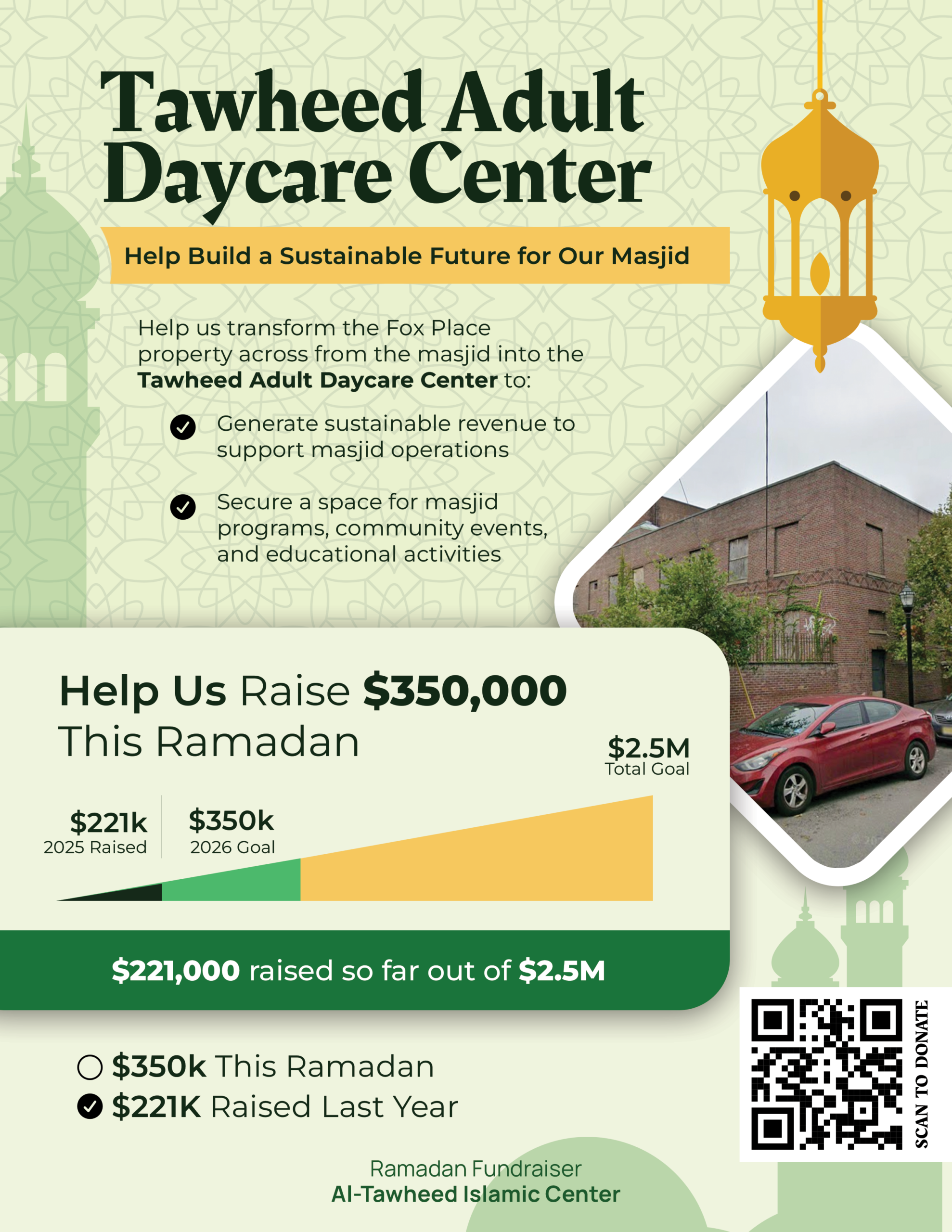 This year, Al Tawheed Islamic Center is raising funds to revive the Fox Place property located across from the masjid and transform it into the Tawheed Adult Daycare Center.